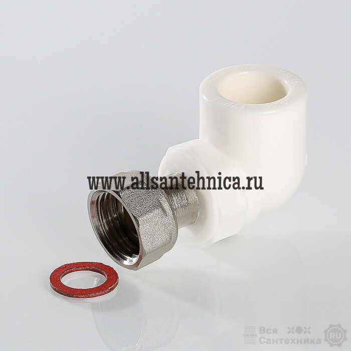 (VTp.758.0) Двухсторонний полипропиленовый фитинг для соединения под углом 90° друг к другу полипропиленового трубопровода и компонента инженерной системы с резьбовым подключением. Монтаж осуществляется с помощью накидной гайки. Резьба – внутренняя трубная по ГОСТу 6357.