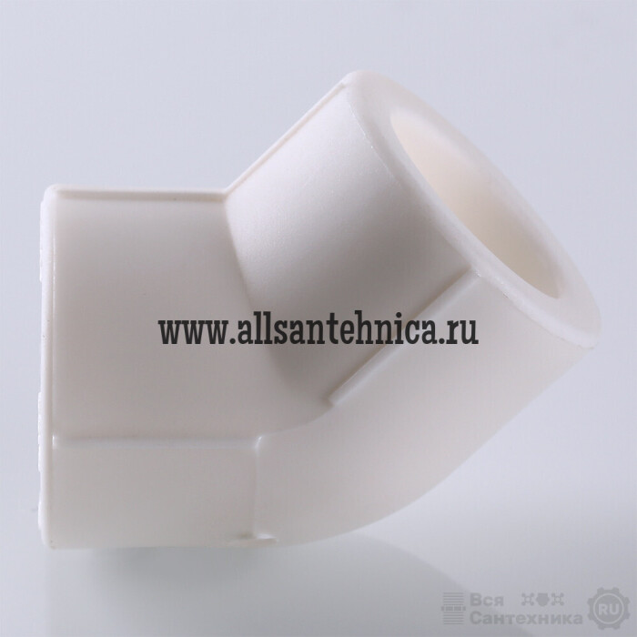 (VTp.759.0) Двухсторонний угловой полипропиленовый фитинг (отвод), позволяющий изменить направление полипропиленового трубопровода на 45°. Монтаж осуществляется методом раструбной сварки.