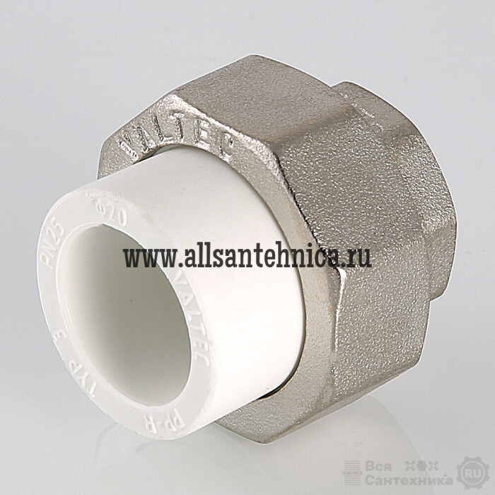 (VTp.762.0) Полипропиленовый фитинг для создания разъемного, с использованием накидной гайки, соединения полипропиленового трубопровода с трубопроводом или арматурой из других материалов. Уплотнительное кольцо выполнено из синтетического каучука EPDM. Резьба фитинга – внутренняя трубная по ГОСТу 6357.