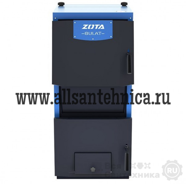 В качестве топлива можно использовать дрова, различные сорта угля, и также древесные и угольные брикеты. В зависимости от вида топлива время горения может составить до 38 часов. Конструкция топки шахтная, горение нижнее. Опционально котел Zota Bulat 45 можно оборудовать электрическим ТЭНом, регулятором тяги, дымососом, комплектом автоматики горения ТurboSet, и даже газовой или пеллетной горелкой.