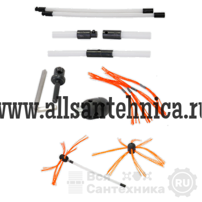 Роторный набор «Труботяга» предназначен для чистки дымоходов. Комплект состоит из пяти гибких нейлоновых рукоятей длиной 1 м и разборной щетки диаметром 450 мм. Рукояти соединяются между собой и могут изгибаться под углом 90°, что позволяет чистить труднодоступные места и дымоходы с изгибом.