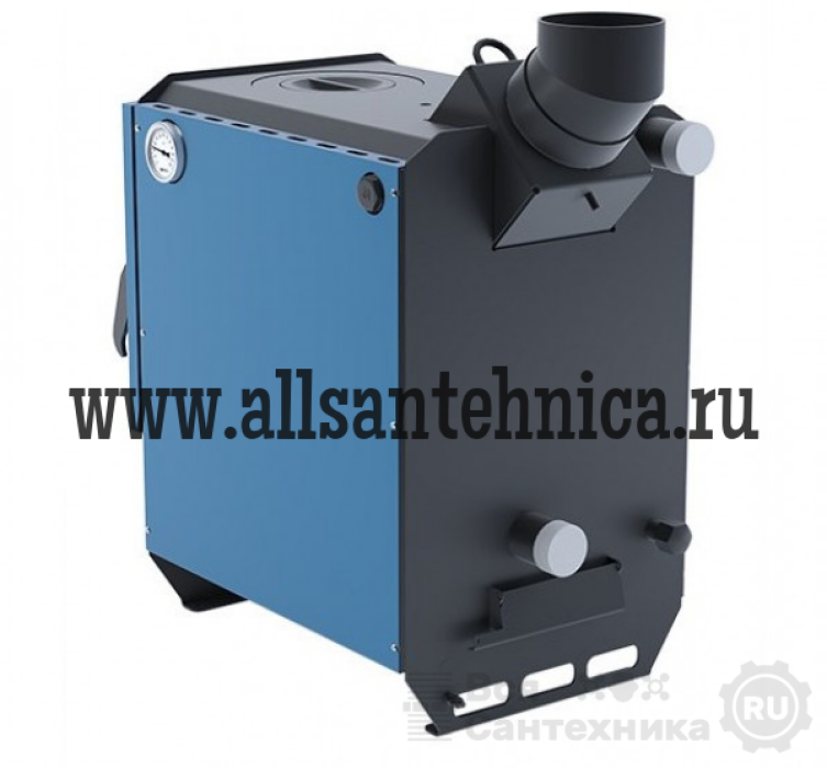 Котел стальной, и сделан из листового железа толщиной 3 мм. Загрузка твердого топлива фронтальная. В камеру сгорания помещаются дрова длиной до 400 мм. Общий объем топочной камеры составляет 26 литра. Колосники чугунные, долговечные.